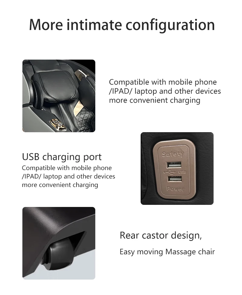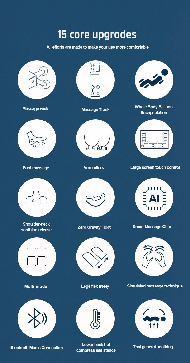 ● Straight rail ● Walking, kneading and beating massage movement ● Large Screen hand controller and shortcut buttom ● Full body airbag wrap massage ● Foot roller massage ● One-button zero gravity function ● Premium Bluetooth® Speakers ● AI intelligent voice assistant